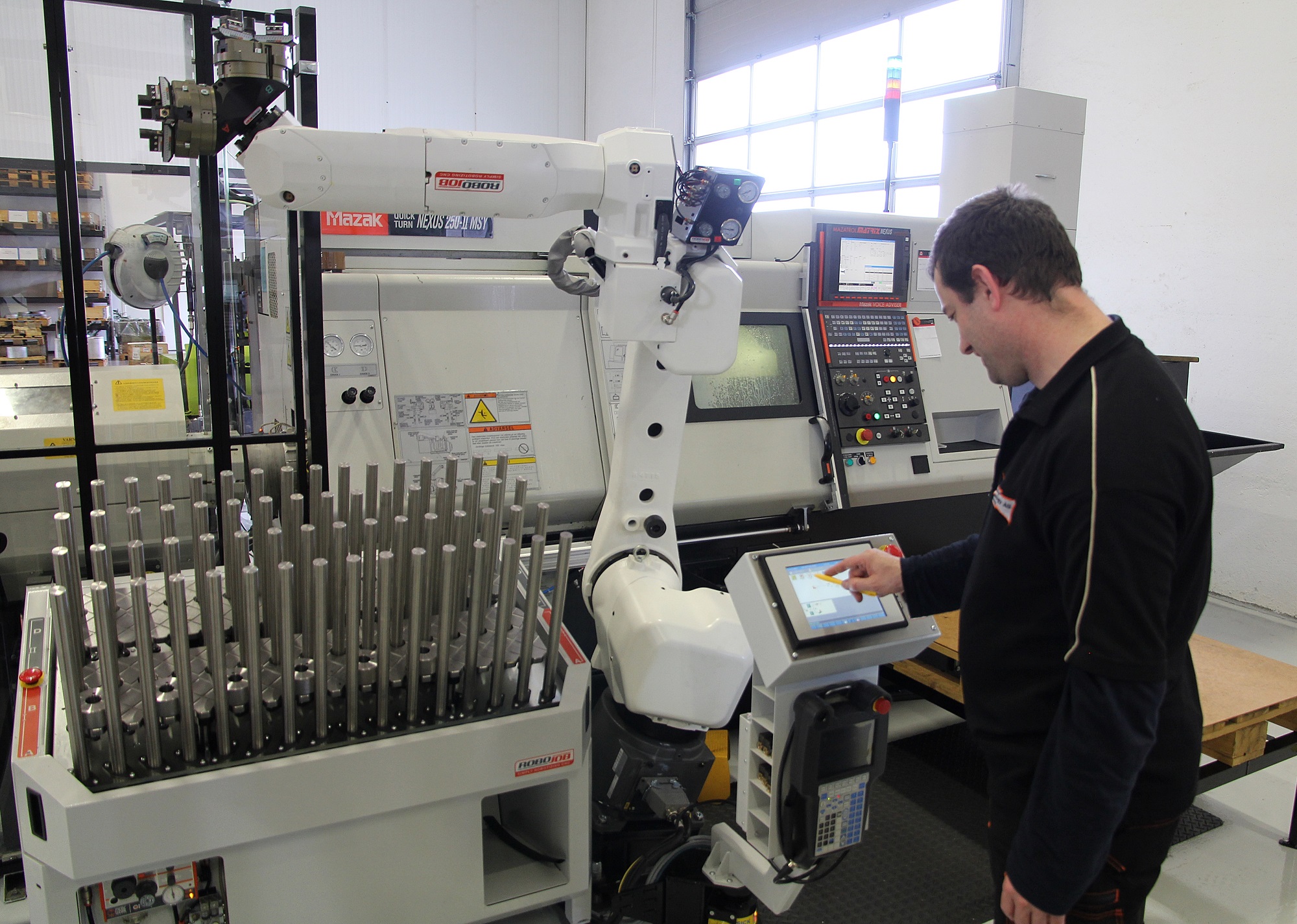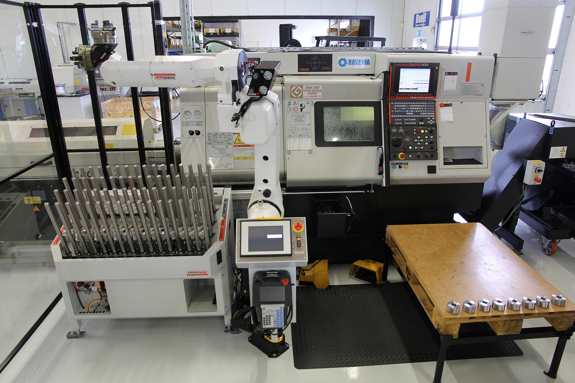 As Norway’s first Ravema customer with Robojob has Ultra Technology AS chosen a solution containing both the automatic, patented, feed table, the robot can both pick from, place parts in, and a solution where the robot can unload on a pallet.